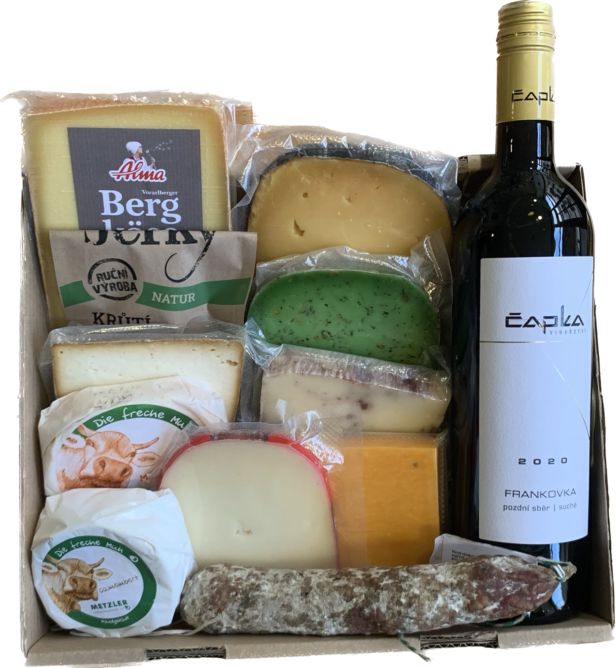 Balíček obsahuje standartně mix sýrů, delikatesu (klobása, paštika, sušenky..), víno a překvapení (může se jednat o malý dip k sýrům, mazací sýr, zahraniční limonádu, nůž na sýry, škrabku na sýry… )